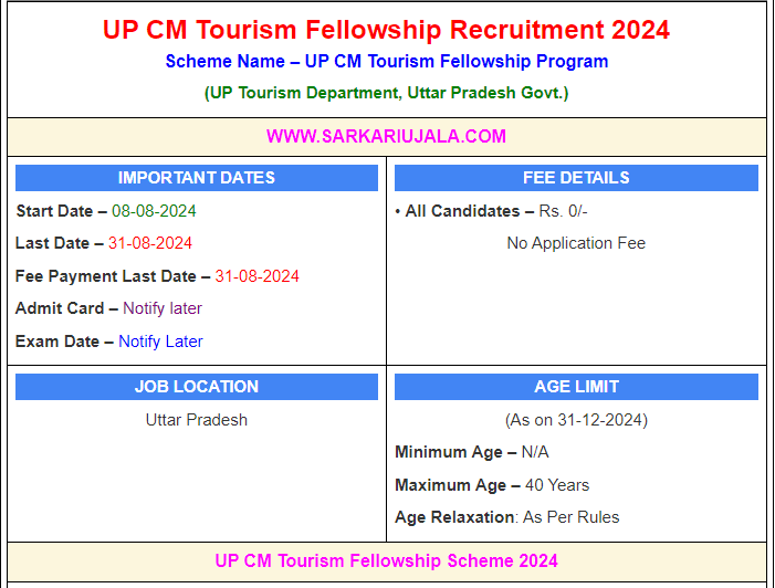 UP CM Tourism Fellowship Recruitment 2024Scheme Name – UP CM Tourism Fellowship Program(UP Tourism Department, Uttar Pradesh Govt.) | |||||