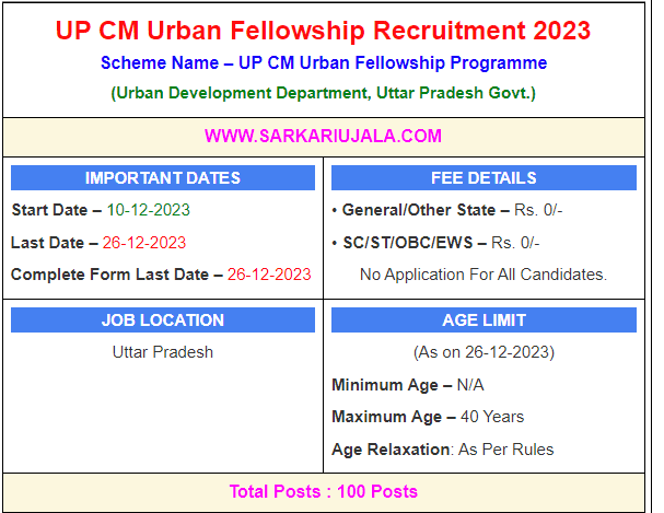 Post Description – Urban Development Department, Uttar Pradesh is inviting online applications for Fellowship for 100 posts. Interested people meet all the eligibility criteria, apply online Details Of Recruitment Of UP CM Urban Fellowship Online Form 2023Posts Name – Fellowship Programme Number Of Posts – 100 Posts Pay Scale – As Per Rules Education Qualification – Bachelor Degree in Any Stream with 60% Marks And Knowledge of Computer How to Apply Online UP CM Urban Fellowship Online Form 2023 – Candidates can apply through link provided below or they can also apply through official site of the Urban Development Department, Uttar Pradesh before 26/December/2023. Required Documents For Online Application – Educational Mark sheet And Certificates Aadhar Card / Pan Card Passport Size Photo Signature Selection Mode – Written Exam Merit List | |||||