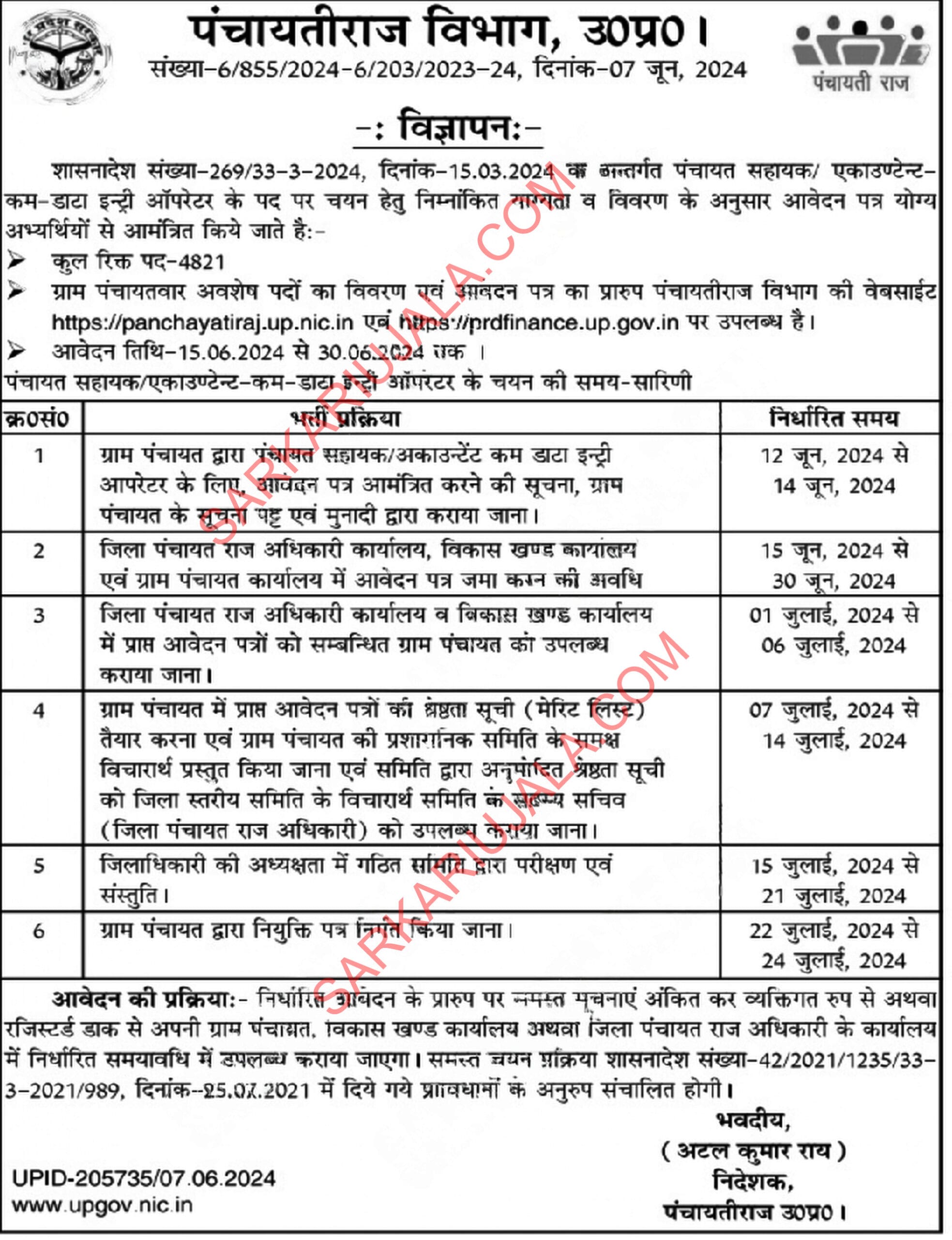 Post Description –UP Panchayati Raj Department is inviting offline applications for Panchayat Assistant for 4821 posts. Interested people meet all the eligibility criteria, apply online Details Of Recruitment Of UP Panchayat Sahayak Offline Form 2024Posts Name – Panchayat Sahayak Cum Data Entry Operator DEO Number Of Posts – 4821 Posts Pay Scale – Rs.6000/- Per Month Education Qualification – Minimum 12th Class Pass From Any Recognized Board & Must be a resident of the same Gram Panchayat How to Apply Online UP Panchayat Sahayak Offline Form 2024 – Candidates can Download Offline Form through link provided below or they can also apply through official site of the Uttar Pradesh Panchayati Raj Department before 30 June 2024. Required Documents For Online Application – 10th / 12th/Graduation Mark sheet And Certificates Aadhar Card / Pan Card Passport Size Photo Signature Selection Mode – Final Merit List
