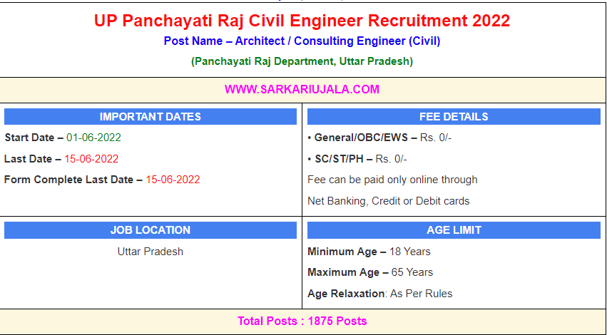 UP Panchayati Raj Civil Engineer Recruitment 2022Post Name – Architect / Consulting Engineer (Civil)(Panchayati Raj Department, Uttar Pradesh) | |||||