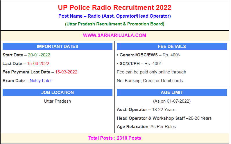 Post Description –Uttar Pradesh Recruitment & Promotion Board UPPRPB is inviting online applications for Radio Group for 2310 posts. Interested people meet all the eligibility criteria, apply online Details Of Recruitment Of UP Police Radio Online Form 2022Posts Name – Radio (Asst. Operator/Head Operator) Number Of Posts – 2310 Posts Category Wise Posts – Assistant Operator – 1374 Posts General – 552 Posts OBC – 370 Posts SC – 288 Posts ST – 27 Posts EWS – 137 Posts Head Operator – 936 Posts General – 379 Posts OBC – 252 Posts SC – 195 Posts ST – 18 Posts EWS – 92 Posts Pay Scale – As Per Rules Education Qualification – Assistant Operator 12th Passed With Physics & Math Head Operator– Diploma in Engineering (Electronics / Telecommunication / Electrical / Computer Science / IT / Mechanical.) How to Apply Online UP Police Radio Online Form 2022– Candidates can apply through link provided below or they can also apply through official site of the Uttar Pradesh Recruitment & Promotion Board before 28/Feb /2022. Required Documents For Online Application – Educational Mark sheet And Certificates Aadhar Card / Pan Card Passport Size Photo Signature Selection Mode – Written Examination PET/PST Skill Test Final Merit List