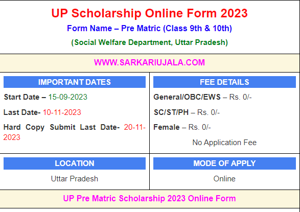 UP Scholarship Online Form 2023Form Name – Pre Matric (Class 9th & 10th)(Social Welfare Department, Uttar Pradesh) | |||||