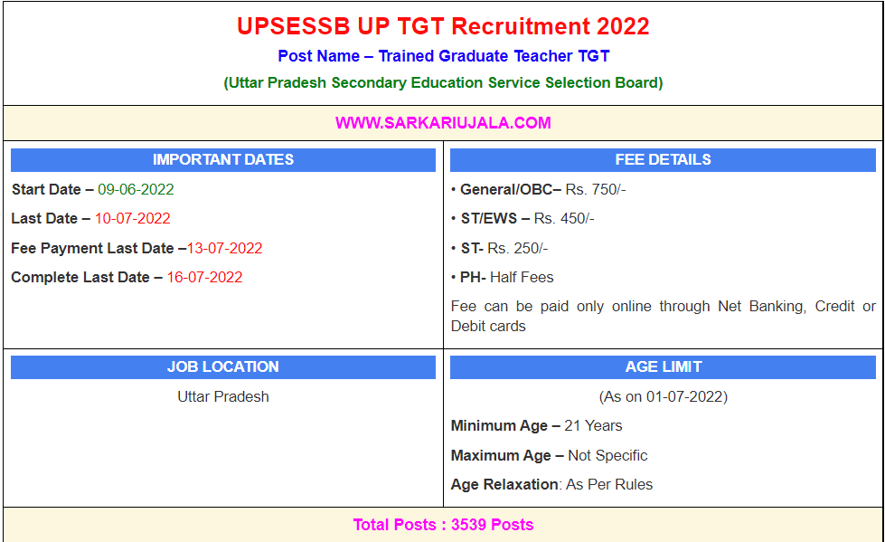 UPSESSB UP TGT Recruitment 2022Post Name – Trained Graduate Teacher TGT(Uttar Pradesh Secondary Education Service Selection Board) | |||||