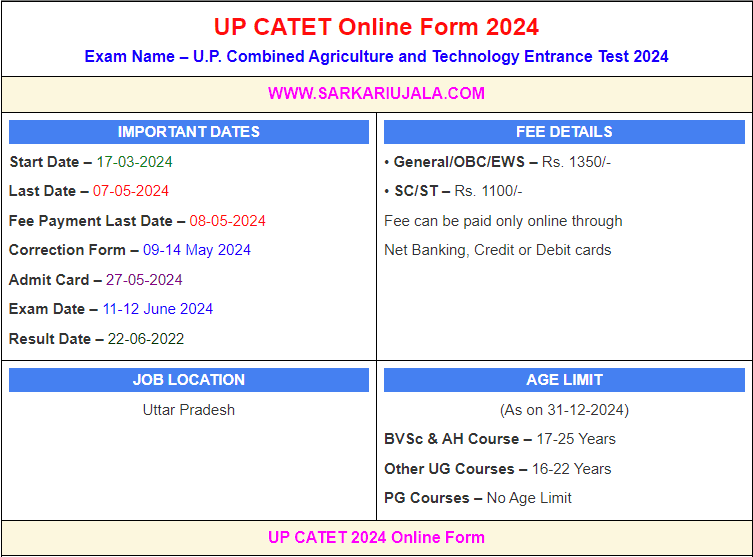 How to Apply Online UP CATET 2024 Online FormCandidates can apply through link provided below or they can also apply through official site of the Sardar Vallabhbhai Patel University before 07/May/2024.