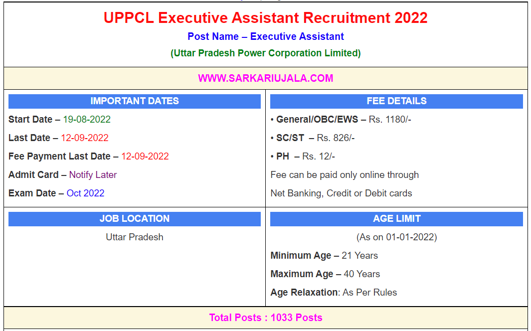 Post Description – UPPCL Uttar Pradesh Power Corporation Limited is inviting online applications for Executive Assistant for 1273 posts. Interested people meet all the eligibility criteria, apply online Details Of Recruitment Of UPPCL Executive Assistant Online Form 2022Posts Name – Executive Assistant Number Of Posts – 1273 Posts Category Wise Posts – General – 512 Posts OBC – 344 Posts SC – 266 Posts ST – 24 Posts EWS – 127 Posts Pay Scale – Rs.27,200 – 86,100/- + Grade Pay Education Qualification – Bachelor Degree in Any Stream & Hindi Typing : 30 WPM How to Apply Online UPPCL Executive Assistant Online Form 2022 – Candidates can apply through link provided below or they can also apply through official site of the Uttar Pradesh Power Corporation Limited before 12/September/2022. Required Documents For Online Application – Graduation Mark sheet And Certificates Aadhar Card / Pan Card Passport Size Photo Signature Selection Mode – CBT Examination Skill Test Final Merit List