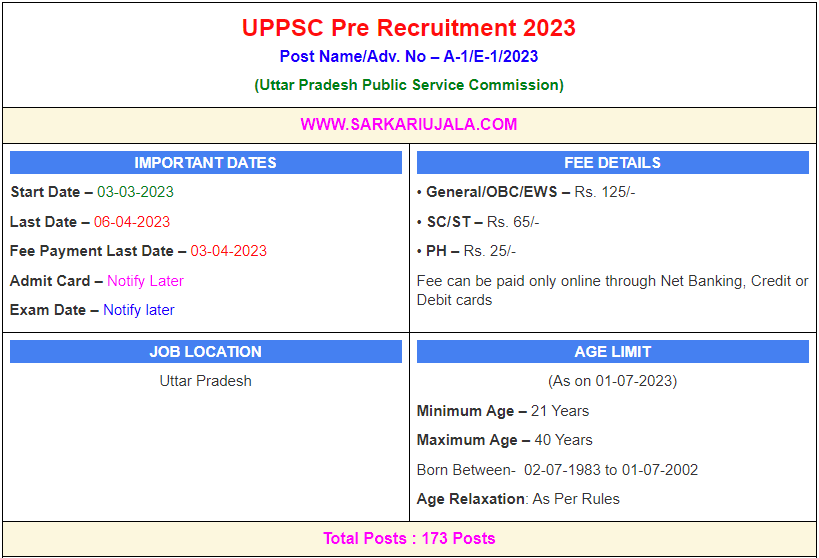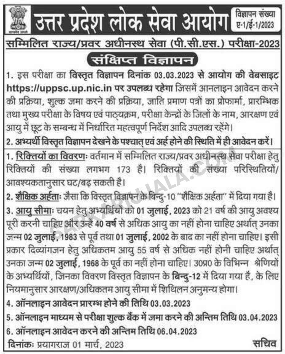 Post DescriptionUPPSC Uttar Pradesh Public Service Commission is inviting online applications for Combined Upper Subordinate Services for 173 posts. Interested people meet all the eligibility criteria, apply online