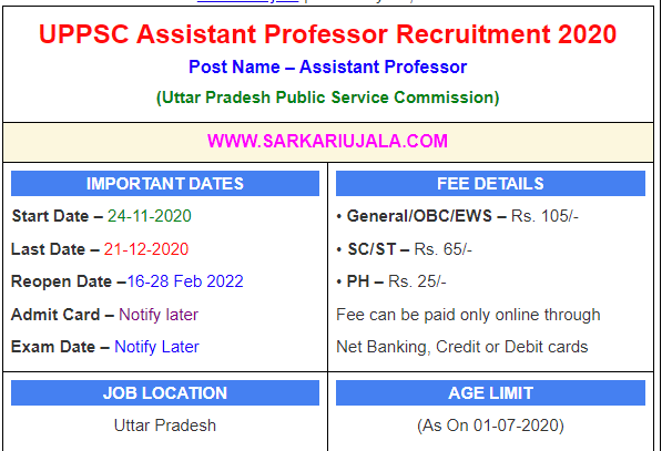 UPPSC Assistant Professor Recruitment 2020Post Name – Assistant Professor(Uttar Pradesh Public Service Commission) | |||||