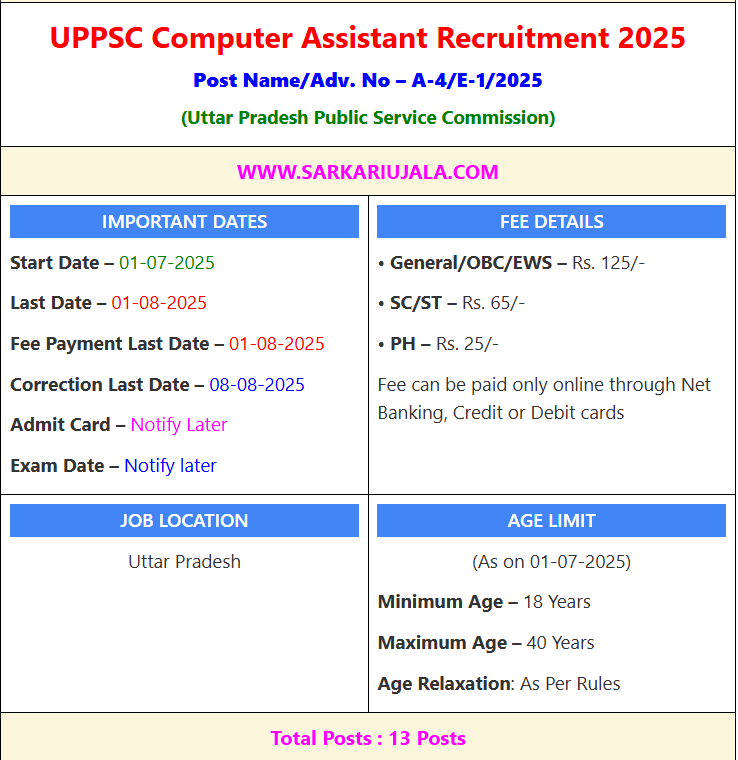 UPPSC Computer Assistant Recruitment 2025Post Name/Adv. No – A-4/E-1/2025(Uttar Pradesh Public Service Commission) | |||||