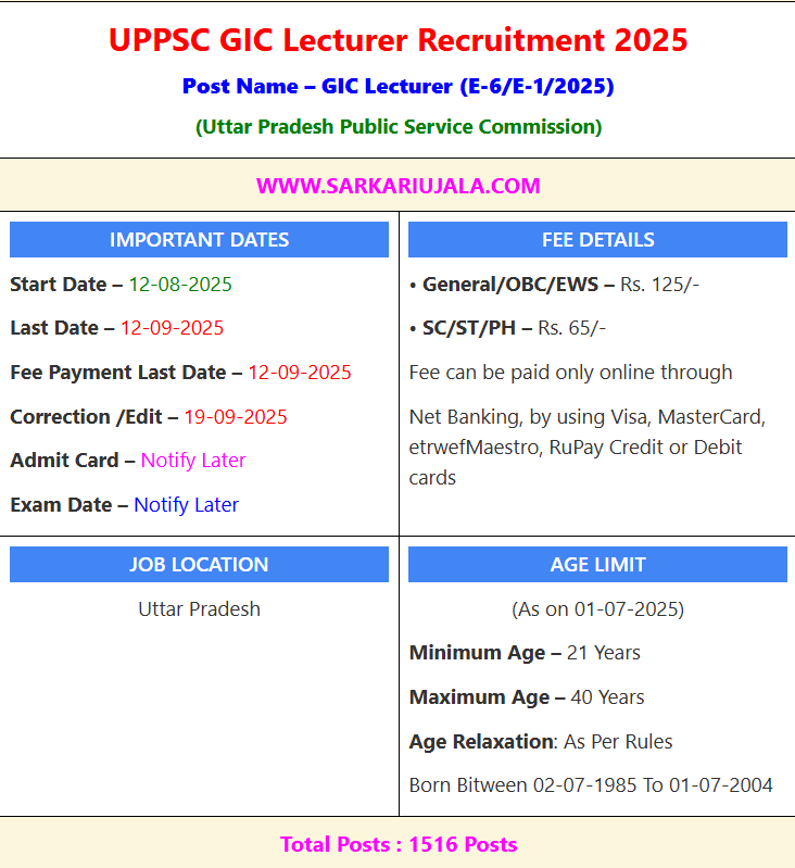 UPPSC GIC Lecturer Recruitment 2025Post Name – GIC Lecturer (E-6/E-1/2025)(Uttar Pradesh Public Service Commission) | |||||