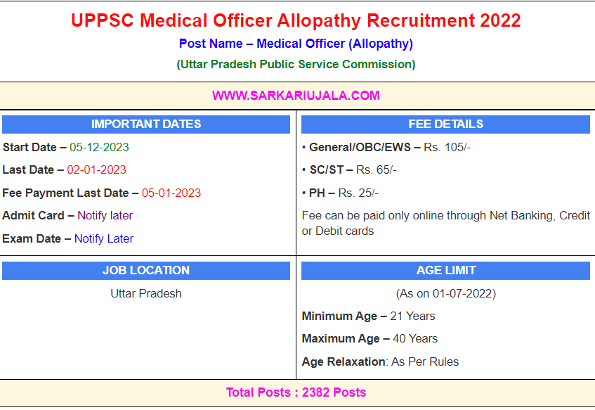 UPPSC Medical Officer Allopathy Recruitment 2022Post Name – Medical Officer (Allopathy)(Uttar Pradesh Public Service Commission) | |||||