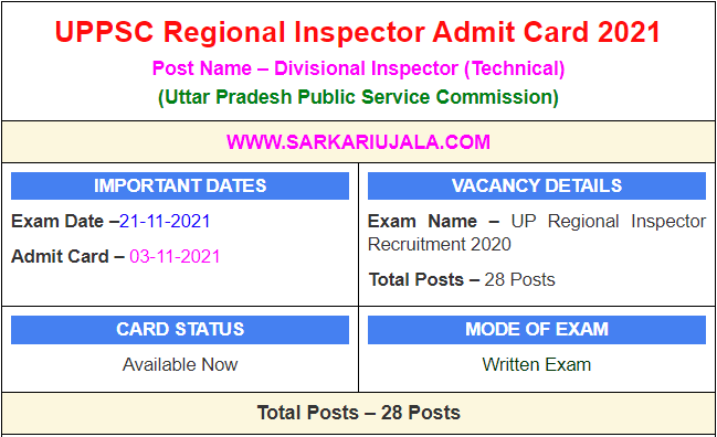 UPPSC Regional Inspector Admit Card 2021Post Name – Divisional Inspector (Technical)(Uttar Pradesh Public Service Commission) | |||||