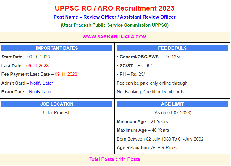 Post Description – UPPSC Uttar Pradesh Public Service Commission UPPSC is inviting online applications for Review Officer / Assistant Review Officer for 411 posts. Interested people meet all the eligibility criteria, apply online Details Of Recruitment Of UPPSC RO / ARO 2023 Online FormPosts Name – Review Officer / Assistant Review Officer Number Of Posts – 411 Posts Pay Scale – As per Rules Education Qualification – Graduation Degree in Any Stream And Hindi Typing : 25 WPM And Knowledge of English Typing And “O” Level Certificate for Some Post How to Apply Online UPPSC RO / ARO 2023 Online Form – Candidates can apply through link provided below or they can also apply through official site of the Uttar Pradesh Public Service Commission UPPSC before 09/November/2023. Required Documents For Online Application – Educational Mark sheet And Certificates Aadhar Card / Pan Card Passport Size Photo Signature Selection Mode – Written Examination Interview Final Merit List
