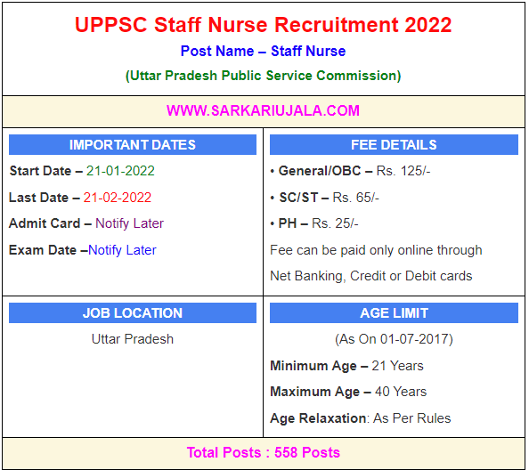 Post Description – UPPSC Uttar Pradesh Public Service Commission is inviting online applications for Staff Nurse for 558 posts. Interested people meet all the eligibility criteria, apply online Details Of Recruitment Of UPPSC Staff Nurse Online Form 2022Posts Name – Staff Nurse Number Of Posts – 558 Posts Pay Scale – As Per Rules Education Qualification – 12th Passed & Diploma in General Nursing and Midwifery OR B.Sc Degree in Nursing registrable with the U.P. Nurses and Midwives Council. OR Possess diploma in Psychiatry registrable with the U.P. Nurses and Midwives Council How to Apply Online UPPSC Staff Nurse Online Form 2021 – Candidates can apply through link provided below or they can also apply through official site of the Uttar Pradesh Public Service Commission before 21/Feb/2022. Required Documents For Online Application – Educational Mark sheet And Certificate Aadhar Card / Pan Card Passport Size Photo Signature Selection Mode – CBT Examination Final Merit List