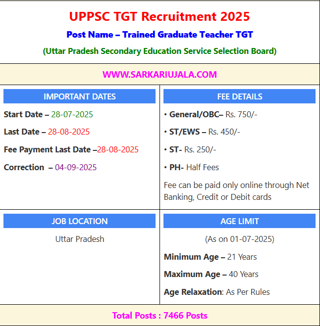 Post Description – UPSESSB Uttar Pradesh Secondary Education Service Selection Board is inviting online applications for Trained Graduate Teacher TGT for 7466 posts. Interested people meet all the eligibility criteria, apply online Details Of Recruitment Of UPSESSB UP TGT Online Form 2025Posts Name – Trained Graduate Teacher TGT Number Of Posts – 7466 Posts Category Wise Posts – Male Branch – 4860 Posts Hindi- 568 Posts English – 540 Posts Math- 556 Posts Science- 764 Posts Social Science- 561 Posts Biology – 185 Posts Art- 383 Posts Sanskrit- 90 Posts Music- 52 Posts Urdu- 102 Posts Home Science- 206 Posts Commerce- 35 Posts Physical Education- 203 Posts Agriculture – 14 Posts Computer- 601 Posts Female Branch – 2525 Posts Hindi- 119 Posts English- 113 Posts Math- 537 Posts Science- 573 Posts Social Science – 140 Posts Biology – 29 Posts Art – 195 Posts Sanskrit – 92 Posts Music- 13 Posts Urdu – 18 Posts Home Science – 163 Posts Commerce- 23 Posts Physical Education- 55 Posts Computer – 455 Posts Backlog- 81 Posts Pay Scale – As Per Rules Education Qualification – Graduation Degree with Related Subject and B.Ed Exam Passed And UPTET Passed How to Apply Online UPSESSB UP TGT Online Form 2025 – Candidates can apply through link provided below or they can also apply through official site of the UPSESSB before 28/August/2025. Required Documents For Online Application – Educational Mark sheet And Certificates Aadhar Card / Pan Card Passport Size Photo Signature Selection Mode – Written Exam Interview Merit List