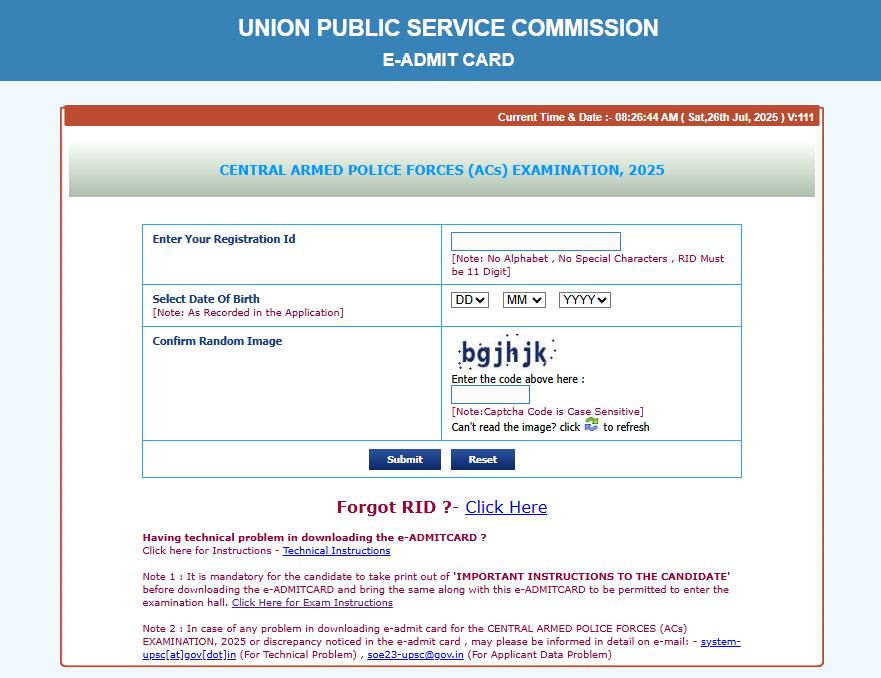 UPSC CAPF AC Admit Card 2025Post Name –CAPF ( Assistant Commandant)(Union Public Service Commission) | |||||