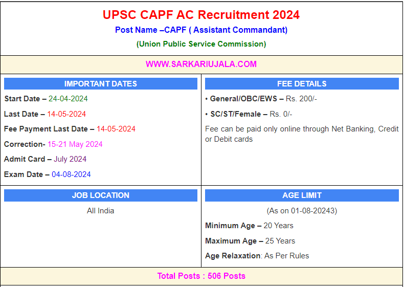 Post Description –UPSC Union Public Service Commission is inviting online applications for Assistant Commandant for 506 posts. Interested people meet all the eligibility criteria, apply online Details Of Recruitment Of UPSC CAPF (AC) Online Form 2024Posts Name – CAPF ( Assistant Commandant) Number Of Posts – 506 Posts Category Wise Posts – BSF – 186 Posts CRPF – 120 Posts CISF – 100 Posts ITBP – 58 Posts SSB – 42 Posts Pay Scale – As Per Rules Education Qualification – Bachelor Degree With Any Subject. Physical Standard Height & Chest Height: 165 cm (Male), 157Cm (Female) Chest : 81cm -86 Cm Race – 100 Meter in 16 Second (Male) ,100 Meter 18 Second (Female) Race – 800 Meter in 3 Minute 45 Second (Male) ,800 Meter in 4 Minute 45 Second (Female) Long Jump – 3.5 Meter (Male ) In 3 Chance, 3 Meter In 3 Chance (Female) Shout Put – 4.5 Meter (Male Only) How to Apply Online UPSC CAPF (AC) Online Form 2024 – Candidates can apply through link provided below or they can also apply through official site of the Union Public Service Commission before 14/May/2024. Required Documents For Online Application – Educational Mark sheet And Certificates Aadhar Card / Pan Card Passport Size Photo Signature Selection Mode – Written Exam PET/PST Merit List