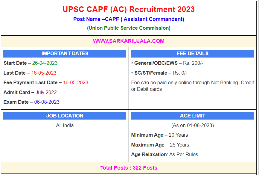 Post Description –UPSC Union Public Service Commission is inviting online applications for Assistant Commandant for 322 posts. Interested people meet all the eligibility criteria, apply online Details Of Recruitment Of UPSC CAPF (AC) Online Form 2023Posts Name – CAPF ( Assistant Commandant) Number Of Posts – 322 Posts Category Wise Posts – BSF – 86 Posts CRPF – 55 Posts CISF – 91 Posts ITBP – 60 Posts SSB – 30 Posts Pay Scale – As Per Rules Education Qualification – Bachelor Degree in Any Subject Physical Standard Height & Chest Height: 165 cm (Male), 157Cm (Female) Chest : 81cm -86 Cm Race – 100 Meter in 16 Second (Male) ,100 Meter 18 Second (Female) Race – 800 Meter in 3 Minute 45 Second (Male) ,800 Meter in 4 Minute 45 Second (Female) Long Jump – 3.5 Meter (Male ) In 3 Chance, 3 Meter In 3 Chance (Female) Shout Put – 4.5 Meter (Male Only) How to Apply Online UPSC CAPF (AC) Online Form 2023 – Candidates can apply through link provided below or they can also apply through official site of the Union Public Service Commission before 16/May/2023. Required Documents For Online Application – Educational Mark sheet And Certificates Aadhar Card / Pan Card Passport Size Photo Signature Selection Mode – Written Examination PET/PST Merit List