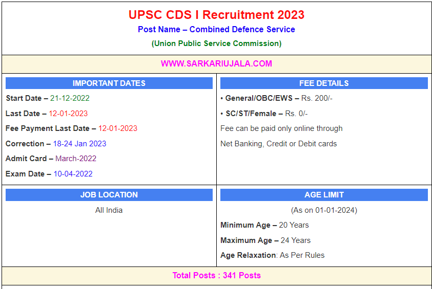 Post Description – UPSC Union Public Service Commission is inviting online applications for UPSC CDS I for 341 posts. Interested people meet all the eligibility criteria, apply online Details Of Recruitment Of UPSC CDS I Online Form 2023Posts Name – Combined Defence Service Number Of Posts – 341 Posts Category Wise Posts – Indian Military Academy (IMA) – 100 Posts Indian Naval Academy (INA) – 22 Posts Air Force Academy – 32 Posts Officers Training Academy (OTA) – 170 Posts OTA Women– 17 Posts Pay Scale – As Per Rules Education Qualification – IMA & OTA– Bachelor Degree in Any Stream. Naval Academy (INA)– Bachelor Degree in Engineering . Airforce – Bachelor Degree in Any Stream with Physics & Math in 12th Exam Physical Standard Height: 157cm (Navy), 162.5Cm (Airforce) Height: 160 cm (Female) How to Apply Online UPSC CDS I Online Form 2023 – Candidates can apply through link provided below or they can also apply through official site of the Union Public Service Commission before 10/January/2023. Required Documents For Online Application – Educational Mark sheet And Certificates Aadhar Card / Pan Card Passport Size Photo Signature Selection Mode – Written Examination PET/PST Final Merit List
