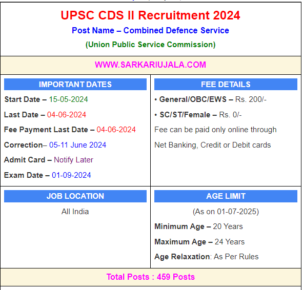 Post Description – UPSC Union Public Service Commission is inviting online applications for UPSC CDS II for 459 posts. Interested people meet all the eligibility criteria, apply online Details Of Recruitment Of UPSC CDS II Online Form 2024Posts Name – Combined Defence Service Number Of Posts – 459 Posts Category Wise Posts – Indian Military Academy (IMA) – 100 Posts Indian Naval Academy (INA) – 32 Posts Air Force Academy – 32 Posts Officers Training Academy (OTA) Men – 276 Posts Officers Training Academy (OTA) Women – 19 Posts Pay Scale – As Per Rules Education Qualification – IMA & OTA– Bachelor Degree in Any Stream. Naval Academy (INA)– Bachelor Degree in Engineering . Airforce – Bachelor Degree in Any Stream with Physics & Math in 12th Exam Physical Standard Height: 157 cm (Navy), 162.5 Cm (Airforce) Height: 160 cm (Female) How to Apply Online UPSC CDS II Online Form 2024 – Candidates can apply through link provided below or they can also apply through official site of the Union Public Service Commission before 04/June/2024. Required Documents For Online Application – Educational Mark sheet And Certificates Aadhar Card / Pan Card Passport Size Photo Signature Selection Mode – Written Examination PET/PST Final Merit List