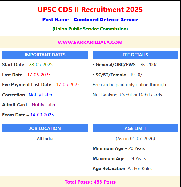 Post DescriptionUPSC Union Public Service Commission is inviting online applications for UPSC CDS II for 453 posts. Interested people meet all the eligibility criteria, apply online
