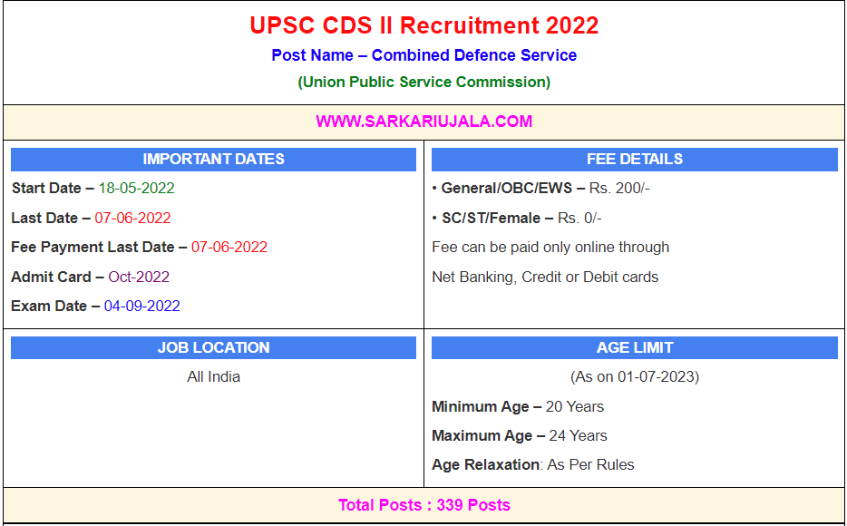 Post Description – UPSC Union Public Service Commission UPSC is inviting online applications for UPSC CDS II for 339 posts. Interested people meet all the eligibility criteria, apply online Details Of Recruitment Of UPSC CDS II Online Form 2022Posts Name – Combined Defence Service Number Of Posts – 339 Posts Category Wise Posts – Indian Military Academy (IMA) – 100 Posts Indian Naval Academy (INA) – 22 Posts Air Force Academy – 32 Posts Officers Training Academy (OTA) – 185 Posts Pay Scale – As Per Rules Education Qualification – IMA & OTA– Bachelor Degree in Any Stream. Naval Academy (INA)– Bachelor Degree in Engineering . Airforce – Bachelor Degree in Any Stream with Physics & Math in 12th Exam Physical Standard Height: 157cm (Navy), 162.5Cm (Airforce) Height: 160 cm (Female) How to Apply Online UPSC CDS I Online Form 2022 – Candidates can apply through link provided below or they can also apply through official site of the Union Public Service Commission before 07/June/2022. Required Documents For Online Application – Educational Mark sheet And Certificates Aadhar Card / Pan Card Passport Size Photo Signature Selection Mode – Written Examination PET/PST Final Merit List