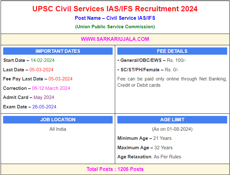 Post Description – UPSC Union Public Service Commission is inviting online applications for IAS/IFS Posts For 1206 posts. Interested people meet all the eligibility criteria, apply online Details Of Recruitment Of UPSC Civil Services IAS/IFS Online Form 2024:Posts Name – Civil Service IAS / Forest Service IFS Number Of Posts – 1206 Posts Category Wise Posts – Civil Service (CS) – 1056 Posts Forest Service – 150 Posts Department Wise Posts –