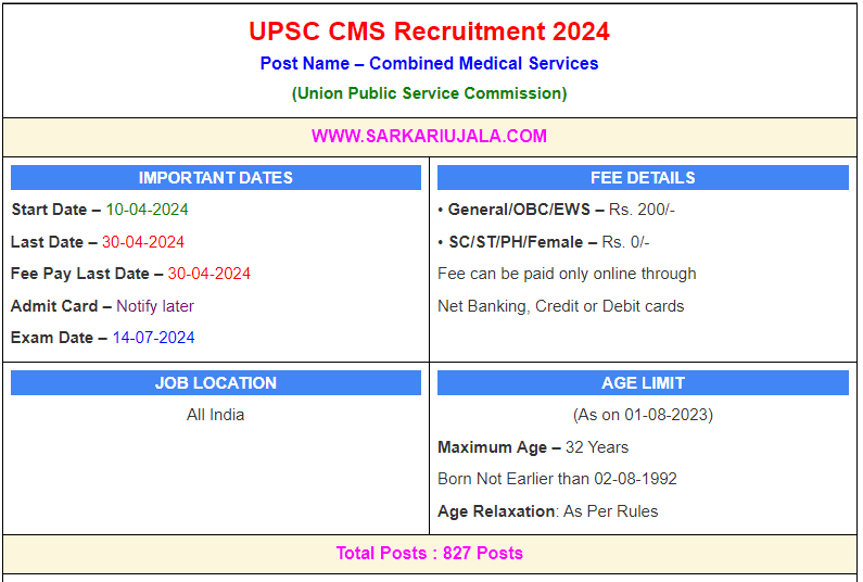Post Description – UPSC Union Public Service Commission is inviting online applications for Combined Medical Services post For 827 Posts. Interested people meet all the eligibility criteria, apply online Details Of Recruitment Of UPSC CMS Online Form 2024Posts Name – Combined Medical Services Number Of Posts – 827 Posts Category Wise Posts – Medical Officers Grade in General Duty Medical Officers of Sub Cadre of Central Health Service – 163 Posts ADMO in Railway – 450 Posts GDMO Grade II in DMC – 14 Posts GDMO in Various Delhi Municipal Council – 200 Posts Pay Scale – As Per Rules Education Qualification – Passed / Appearing Medical Degree in MBBS at Any Recognised University in India. How to Apply Online UPSC CMS Online Form 2024 – Candidates can apply through link provided below or they can also apply through official site of the Union Public Service Commission before 30/April/2024. Required Documents For Online Application – Educational Mark sheet And Certificates Aadhar Card / Pan Card Passport Size Photo Signature Selection Mode – Written Examination. Personality Test Final Merit List