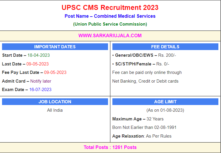 UPSC CMS Recruitment 2023Post Name – Combined Medical Services(Union Public Service Commission) | |||||