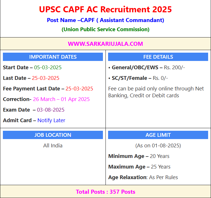 Post Description – UPSC has released the CAPF AC Recruitment 2025 for 357 Assistant Commandant posts. Candidates with a Bachelor’s degree in any subject can apply. Stay tuned for official updates on the application process and selection criteria. Details Of Recruitment Of UPSC CAPF (AC) Online Form 2024Posts Name – CAPF ( Assistant Commandant) Number Of Posts – 357 Posts Category Wise Posts – BSF – 24 Posts CRPF – 204 Posts CISF – 92 Posts ITBP – 04 Posts SSB – 33 Posts Pay Scale – As Per Rules Education Qualification – Bachelor Degree With Any Subject. Physical Standard Height & Chest Height: 165 cm (Male), 157Cm (Female) Chest : 81cm -86 Cm Race – 100 Meter in 16 Second (Male) ,100 Meter 18 Second (Female) Race – 800 Meter in 3 Minute 45 Second (Male) ,800 Meter in 4 Minute 45 Second (Female) Long Jump – 3.5 Meter (Male ) In 3 Chance, 3 Meter In 3 Chance (Female) Shout Put – 4.5 Meter (Male Only) How to Apply Online UPSC CAPF (AC) Online Form 2025 – Candidates can apply through link provided below or they can also apply through official site of the Union Public Service Commission before 25/March/2025. Required Documents For Online Application – Educational Mark sheet And Certificates Aadhar Card / Pan Card Passport Size Photo Signature Selection Mode – Written Exam PET/PST Merit List
