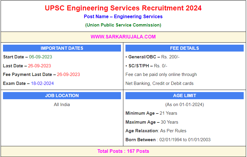 Post Description – UPSC Union Public Service Commission is inviting online applications for Engineering Service for 167 posts. Interested people meet all the eligibility criteria, apply online Details Of Recruitment Of UPSC Engineering Services Online Form 2024-Posts Name – Engineering Service Number Of Posts – 167 Posts Category Wise Posts – Civil Engineering Mechanical Engineering Electrical Engineering Electronics & Telecommunication Engineering Pay Scale – As Per Rules Education Qualification – Bachelor In Engineering Degree in Related Trade / Stream . Note– For More Details Candidates Must Read Official Notification Exam Center– Agartala, Ahmedabad, Aizawl, Aligarh, Prayagraj, Bagalore, Bareilly, Bhopal, Chandigarh, Chennai, Cuttack, Dehradun, Delhi, Dharwad, Guwahati, Gangtok, Hyderabad, Imphal, Itanagar, Jaipur, Jammu, Jorhat, Kochi, Kohima, Kolkata, Lucknow, Madurai, Mumbai, Nagpur, Panaji, Patna, Port Blair, Raipur, Ranchi, Sambhalpur, Shillong, Shimla, Srinagar, Trivandrum, Tirupati, Udaipur & Vishakhapatnam How to Apply Online UPSC Engineering Services Online Form 2023 – Candidates can apply through link provided below or they can also apply through official site of the Union Public Service Commission before 26/September/2023. Required Documents For Online Application – Educational Mark sheet And Certificates Aadhar Card / Pan Card Passport Size Photo Signature Selection Mode – Pre Exam Mains Exam Interview Merit List