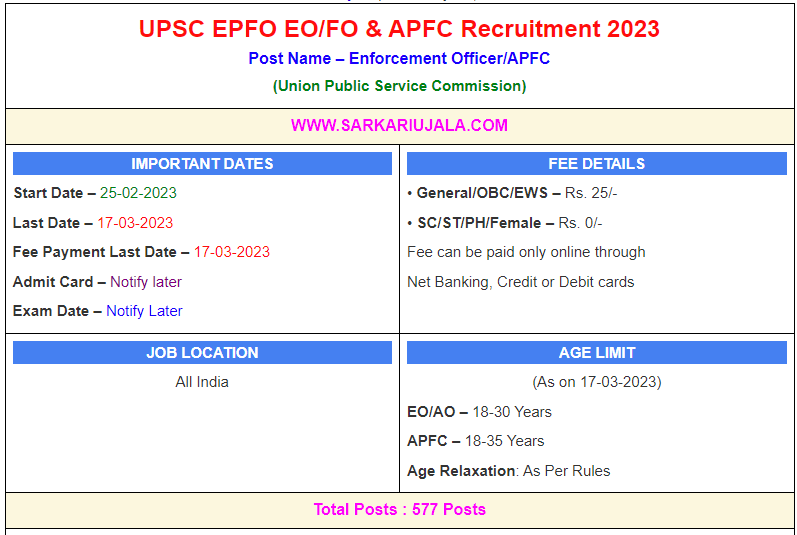 Post Description – UPSC Union Public Service Commission is inviting online applications for APFC & Enforcement Officer/Accounts Officer for 577 posts. Interested people meet all the eligibility criteria, apply online Details Of Recruitment Of UPSC EPFO EO/FO & APFC Online Form 2023Posts Name – APFC & EO/AO Number Of Posts – 577 Posts Category Wise Posts – Enforcement Officer/Accounts Officer– 418 Posts General – 204 Posts OBC – 78 Posts SC – 57 Posts ST – 28 Posts EWS – 51 Posts Assistant Provident Fund Commissioner – 159 Posts General – 68 Posts OBC – 38 Posts SC – 25 Posts ST – 12 Posts EWS – 16 Posts Pay Scale – Level 8 & Level 10 Education Qualification – Bachelor’s Degree in any subject How to Apply Online UPSC EPFO EO/FO & APFC Online Form 2023 – Candidates can apply through link provided below or they can also apply through official site of the Union Public Service Commission before 17/March/2023. Required Documents For Online Application – Educational Mark sheet And Certificates Aadhar Card / Pan Card Passport Size Photo Signature Selection Mode – Written Examination Main Exam Interview Merit List