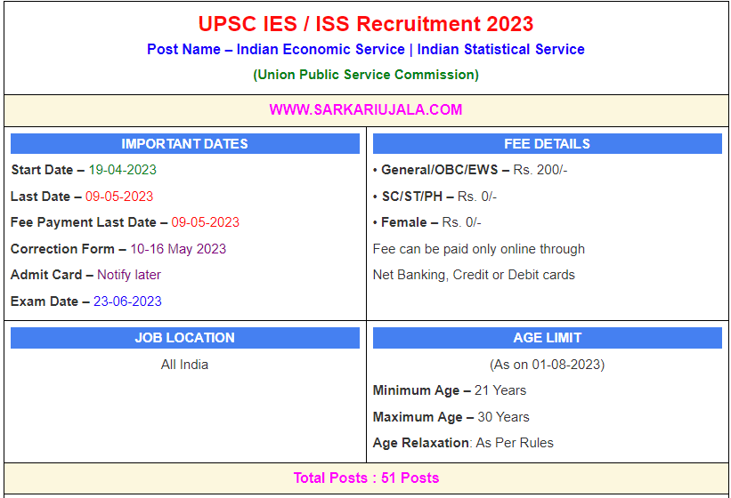 Post Description – UPSC Union Public Service Commission is inviting online applications for IES /ISS for 51 posts. Interested people meet all the eligibility criteria, apply online Details Of Recruitment Of UPSC IES / ISS Online Form 2023Posts Name – Indian Economic Service | Indian Statistical Service Number Of Posts – 51 Posts Category Wise Posts – IES– 18 Posts ISS – 33 Posts Pay Scale – As Per Rules Education Qualification – IES– Post-Graduate Degree in Economics/ Applied Economics/ Business Economics/ Econometrics ISS – Bachelor’s Degree with Statistics/ Mathematical Statistics/ Applied Statistics as one of the subjects OR a Master’s degree in Statistics/ Mathematical Statistics/ Applied Statistics How to Apply Online UPSC IES / ISS Online Form 2023 – Candidates can apply through link provided below or they can also apply through official site of the Union Public Service Commission before 09/May/2023. Required Documents For Online Application – Educational Mark sheet And Certificates Aadhar Card / Pan Card Passport Size Photo Signature Selection Mode – Written Exam Interview Merit List