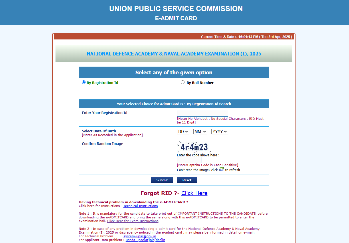 UPSC NDA I Admit Card 2025Post Name – NDA & NA (Male/Female)(Union Public Service Commission) | |||||
