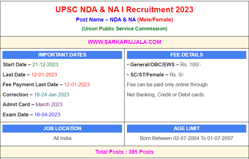 Post Description – UPSC Union Public Service Commission is inviting online applications for NDA & NA . Interested people meet all the eligibility criteria, apply online Details Of Recruitment Of UPSC NDA & NA I Online Form 2023Posts Name – NDA & NA Number Of Posts – 395 Posts Category Wise Posts – NDA – 370 posts Army – 208 Posts Navy – 40 Posts Airforce – 120 Posts NA – 25 Posts Pay Scale – As Per Rules Education Qualification – NDA- 12th Passed From A Recognized Board. NA- 12th Passed/Appearing With Physics And Mathematics. Physical Standard Height: 157 cm (Male), 152 Cm (Female) How to Apply Online UPSC NDA & NA I Online Form 2023 – Candidates can apply through link provided below or they can also apply through official site of the Union Public Service Commission before 10/January/2023. Required Documents For Online Application – 10th / 12th Mark sheet And Certificates Aadhar Card / Pan Card Passport Size Photo Signature Selection Mode – Written Examination PET/PST Merit List