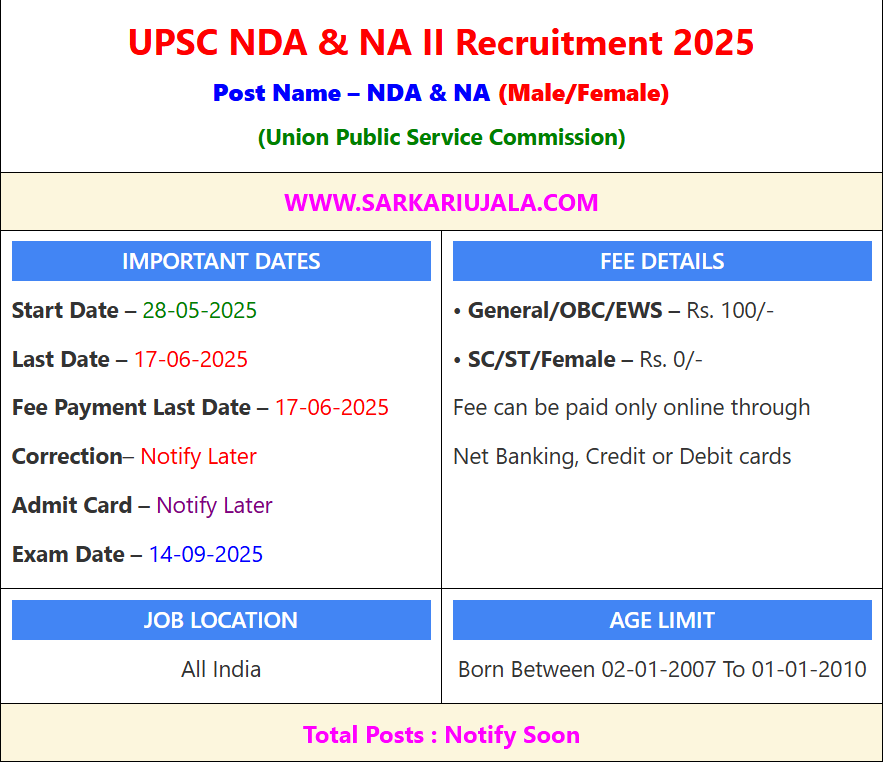Post Description – UPSC Union Public Service Commission is inviting online applications for NDA & NA For 406 posts. Interested people meet all the eligibility criteria, apply online Details Of Recruitment Of UPSC NDA & NA II Online Form 2025Posts Name – NDA & NA Number Of Posts – 406 Posts Category Wise Posts – NDA – 370 Posts Army – 208 Posts Navy – 42 Posts Airforce – 120 Posts NA – 36 Posts Pay Scale – As Per Rules Education Qualification – NDA – 12th Class Pass From A Recognized Board. NA – 12th Class Pass/Appearing With Physics /Math Physical Standard Height: 157 cm (Male), 152 Cm (Female) How to Apply Online UPSC NDA & NA II Online Form 2025 – Candidates can apply through link provided below or they can also apply through official site of the Union Public Service Commission before 17/June/2025. Required Documents For Online Application – 10th / 12th Mark sheet And Certificates Aadhar Card / Pan Card Passport Size Photo Signature Selection Mode – Written Exam PET/PST Final Merit List