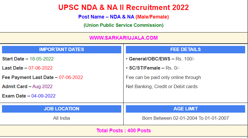 Post Description –UPSC Union Public Service Commission UPSC is inviting online applications for NDA & NA for 400 posts. Interested people meet all the eligibility criteria, apply online Details Of Recruitment Of UPSC NDA & NA II Online Form 2022Posts Name – NDA & NA Number Of Posts – 400 Posts Category Wise Posts – NDA – 370 Posts Army – 208 Posts Navy – 42 Posts Airforce – 120 Posts NA – 30 Posts Pay Scale – As Per Rules Education Qualification – NDA- 12th Class Pass From A Recognized Board. NA- 12th Class Pass/Appearing With Physics /Math Physical Standard Height: 157 cm (Male), 152 Cm (Female) How to Apply Online UPSC NDA & NA II Online Form 2022 – Candidates can apply through link provided below or they can also apply through official site of the Union Public Service Commission before 07/June/2022. Required Documents For Online Application – 10th / 12th Mark sheet And Certificates Aadhar Card / Pan Card Passport Size Photo Signature Selection Mode – Written Examination PET/PST Final Merit List