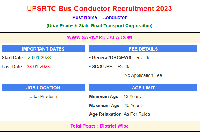 UPSRTC Bus Conductor Recruitment 2023Post Name – Conductor(Uttar Pradesh State Road Transport Corporation) | ||||||