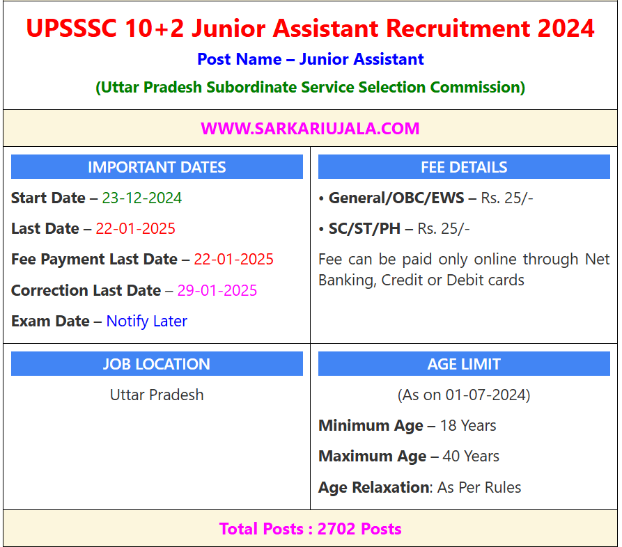 UPSSSC 10+2 Junior Assistant Recruitment 2024Post Name – Junior Assistant(Uttar Pradesh Subordinate Service Selection Commission) | |||||