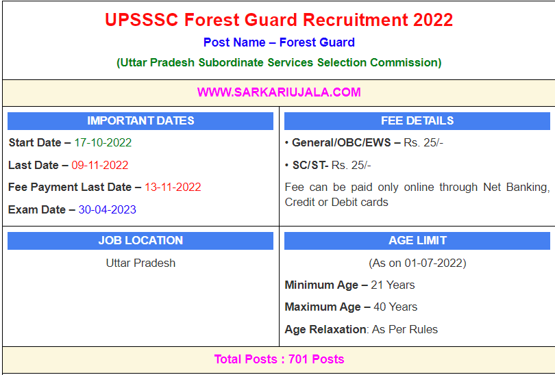 UPSSSC Forest Guard Recruitment 2022Post Name – Forest Guard(Uttar Pradesh Subordinate Services Selection Commission) | |||||