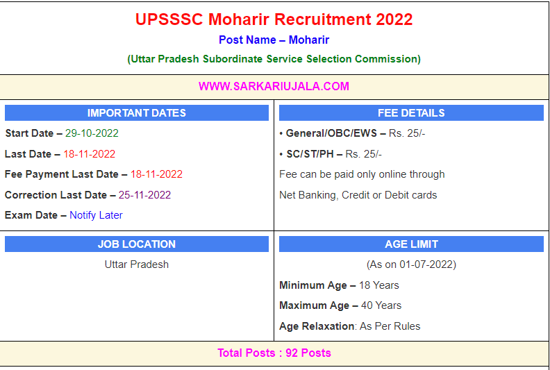 UPSSSC Moharir Recruitment 2022Post Name – Moharir(Uttar Pradesh Subordinate Service Selection Commission) | |||||