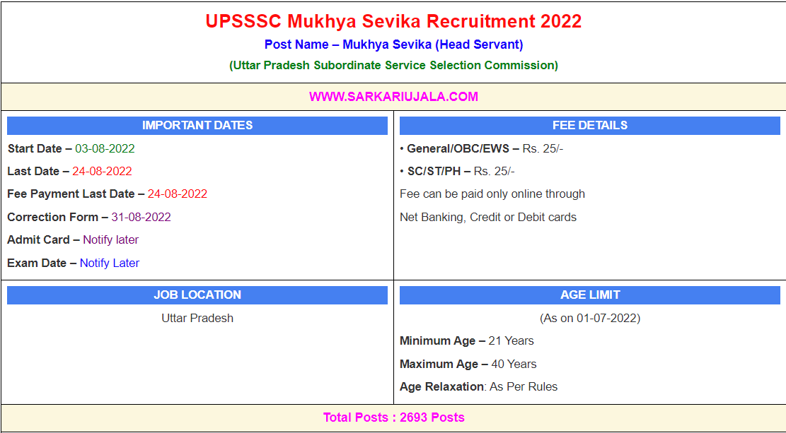 UPSSSC Mukhya Sevika Recruitment 2022Post Name – Mukhya Sevika (Head Servant)(Uttar Pradesh Subordinate Service Selection Commission) | |||||
