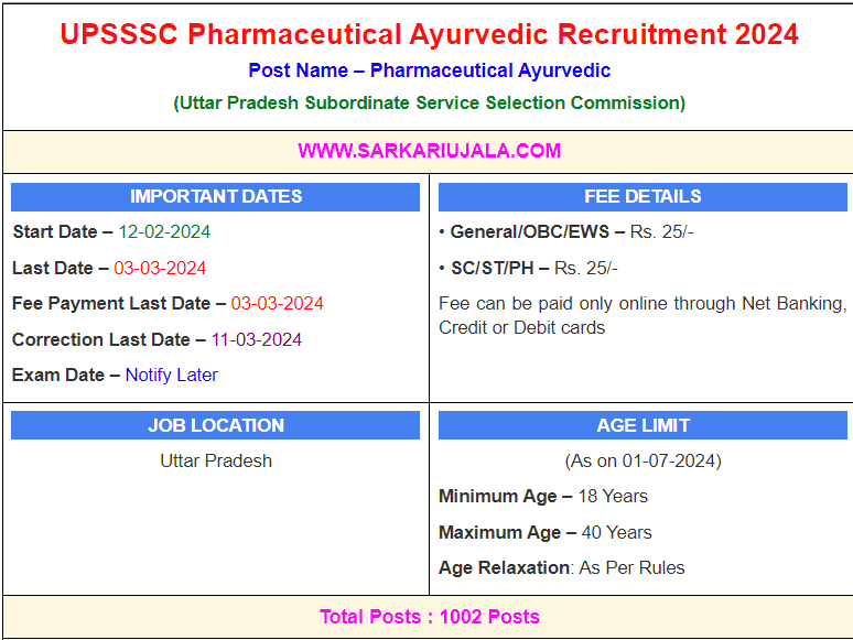 Post Description – UPSSSC Uttar Pradesh Subordinate Service Selection Commission is inviting online applications for Pharmaceutical Ayurvedic for 1002 posts. Interested people meet all the eligibility criteria, apply online Details Of Recruitment Of UPSSSC Pharmaceutical Ayurvedic Online Form 2024Posts Name – Pharmaceutical Ayurvedic Number Of Posts – 1002 Posts Category Wise Posts – General – 448 Posts OBC – 126 Posts SC – 291 Posts ST – 37 Posts EWS – 100 Posts Pay Scale – As Per Rules Education Qualification – 10+2 Passed with Biology / Mathematics Subject And Diploma in Pharmaceutical Ayurvedic and Registration in Council. And UPSSSC PET 2023 Score Card How to Apply Online UPSSSC Pharmaceutical Ayurvedic Online Form 2024 – Candidates can apply through link provided below or they can also apply through official site of the Uttar Pradesh Subordinate Service Selection Commission before 03/March/2024. Required Documents For Online Application – Educational Mark sheet And Certificates Aadhar Card / Pan Card Passport Size Photo Signature Selection Mode – Written Exam Merit List | |||||