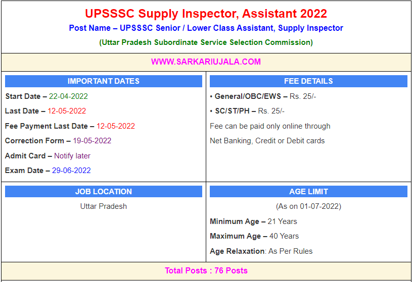 UPSSSC Supply Inspector, Assistant 2022Post Name – UPSSSC Senior / Lower Class Assistant, Supply Inspector(Uttar Pradesh Subordinate Service Selection Commission) | |||||