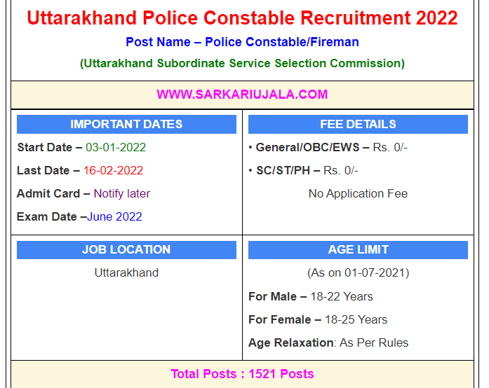 Post Description – Uttarakhand Subordinate Service Selection Commission is inviting online applications for Police Constable/Fireman for 1521 posts. Interested people meet all the eligibility criteria, apply online Details Of Recruitment Of Uttarakhand Police Constable Online Form 2022Posts Name – Police Constable/Fireman/PAC/IRB Number Of Posts – 1521 Posts Category Wise Posts – Constable (Male)– 652 Posts Constable PAC/IRB (Male) – 240 Posts Fireman (Male/Female)– 266 Posts Pay Scale – Rs.21700 – 69100/- (Level 3) Education Qualification –12th Passed From UK /UP Board. Physical Standard Height & Chest For General/OBC/SC Constable Height: 165 cm (Male Only) Fireman Height: 168 cm (Male), 157.5 cm (Female) Chest : 78.8cm -83.8 Cm Height & Chest For ST Constable Height: 157.5 cm (Male ), 157.5 cm (Female) Fireman Height: 152 cm (Male), 147 cm (Female), Chest – 76.3cm – 81.3 cm Running- 3 KM in 20 Minute (Male) ,40 Meter in 16 Second (Female) Long Jump – 13 feet (Male ) In 3 Chance, 8 Feet In 3 Chance (Female) How to Apply Online Uttarakhand Police Constable Online Form 2022 – Candidates can apply through link provided below or they can also apply through official site of the Uttarakhand Subordinate Service Selection Commission before 16/Feb/2022. Required Documents For Online Application – 10th / 12th Mark sheet And Certificates Aadhar Card / Pan Card Passport Size Photo Signature Selection Mode – Written Examination PET/PST Final Merit List