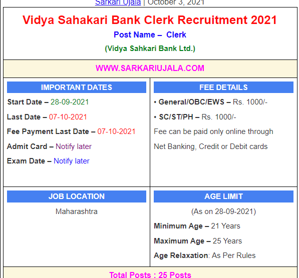 Post DescriptionVidya Sahakari bank Limited is inviting online applications for Clerk for 25 posts. Interested people meet all the eligibility criteria, apply online