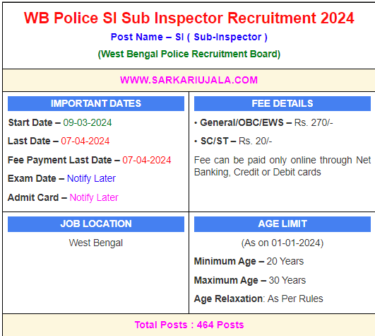 Post Description – WB West Bengal Police Recruitment Board is inviting online applications for Sub-Inspector for 464 posts. Interested people meet all the eligibility criteria, apply online Details Of Recruitment Of WB Police SI Sub Inspector Online Form 2024Posts Name –Sub-Inspector Number Of Posts – 464 Posts Category Wise Posts – General (UR)- 209 Posts SC- 102 Posts ST – 28 Posts OBC-A –46 Posts OBC-B – 33 Posts EWS – 46 Posts Pay Scale – As Per Rules Education Qualification – Bachelor’s degree in any discipline And speak, read and write Bengali Language. How to Apply Online WB Police SI Sub-Inspector Online Form 2024 – Candidates can apply through link provided below or they can also apply through official site of the West Bengal Police Recruitment Board before 07/April/2024. Required Documents For Online Application – Educational Mark sheet And Certificates Aadhar Card / Pan Card Passport Size Photo Signature Selection Mode – Written Exam Merit List