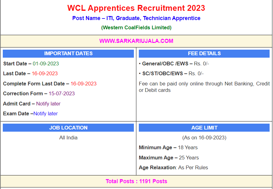 Post Description – WCL Western Coal Fields Limited is inviting online applications for Apprentice for 1191 posts. Interested people meet all the eligibility criteria, apply online Details Of Recruitment Of WCL Apprentices Online Form 2023Posts Name –Apprentice Number Of Posts – 1191 Posts Category Wise Posts – ITI Pass Various Trade Apprentice – 815 Posts Fresher’s Trade Security Guard – 60 Posts Graduate Apprentice – 101 Posts Technician Apprentice – 215 Posts Stipend– As Per Rules Education Qualification – ITI Pass Various Trade Apprentice – ITI Certificate in Related Trade . Fresher’s Trade Security Guard – 10th Passed From Any Recognized Board in India. Graduate Apprentice – BE / B.Tech Mining Engineering Degree. Technician Apprentice – Diploma in Mining Engineering OR Mining OR Mine Surveying in Any Recognized Institute in India. How to Apply Online WCL Apprentices Online Form 2023 – Candidates can apply through link provided below or they can also apply through official site of the Western Coal Fields Limited before 16/September/2023. Required Documents For Online Application – Educational Mark sheet And Certificates Aadhar Card / Pan Card Passport Size Photo Signature Selection Mode – Scrutiny Application Document Verification Merit List