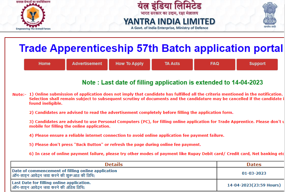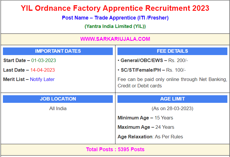 Post Description – YIL Yantra India Ordnance Factory is inviting online applications for Trade Apprentice (ITI /Fresher) for 5395 posts. Interested people meet all the eligibility criteria, apply online Details Of Recruitment Of YIL Yantra India ITI/Fresher Apprentice Online Form 2023Posts Name – Trade Apprentice (ITI /Fresher) Number Of Posts – 5395 Posts Category Wise Posts – ITI- 3514 Posts Non-ITI/Fresher- 1944 Posts Factory Wise Posts – Ordnance Cable Factory, Chandigarh- 45 Posts Gun Carriage Factory Jabalpur- 112 Posts Grey Iron Foundry Jabalpur- 66 Posts Ordnance Factory, Itarsi- 60 Posts Ordnance Factory, Khamaria, Jabalpur- 529 Posts Ordnance Factory, Katni- 84 Posts Vehicle Factory Jabalpur- 70 Posts High Explosive Factory Kirkee, Pune- 82 Posts Machine Tool Prototype Factory, Ambernath, Thane- 107 Posts Ordnance Factory Ambajhari, Nagpur- 390 Posts Ordnance Factory Ambernath, Thane- 70 Posts Ordnance Factory Bhandara- 251 Posts Ordnance Factory Bhusawal- 87 Posts Ordnance Factory Chanda, Chandrapur- 242 Posts Ordnance Factory Dehu Road, Pune- 124 Posts Ordnance Factory Varangaon- 100 Posts Ammunition Factory Khadki, Pune- 98 Posts Ordnance Factory Badmal, Bolangir- 148 Posts Cordite Factory Arvankadu- 47 Posts High Energy Projectile Factory, Tiruchirapalli- 11 Posts Heavy Vehicles Factory Avadi , Chennai – 374 Posts Ordnance Factory Project Medak, Hyderabad- 438 Posts Field Gun Factory Kanpur- 45 Posts Ordnance Factory Kanpur- 60 Posts Ordnance Factory Muradnagar- 201 Posts Ordnance Parachute Factory Kanpur- 192 Posts Small Arms Factory Kanpur- 130 Posts Ordnance Factory Dehradun- 92 Posts Opto Electronic Factory Dehradun- 105 Posts Gun and Shell Factory, Cossipore- 172 Posts Metal and Steel Factory Ishapore- 193 Posts Ordnance Factory Dum Dum, Kolkata- 214 Posts Rifle Factory Ishapore, Kolkata- 31 Posts Stipend – As Per Rules Education Qualification – ITI- 10th Passed with 50% and ITI / NCVT Certificate in Related Trade. Non-ITI/Fresher- 10th Passed with 50% in Aggregate and with 40% Marks in Mathematics and Science Each. How to Apply Online YIL Yantra India Apprentice Online Form 2023 – Candidates can apply through link provided below or they can also apply through official site of the Yantra India. Required Documents For Online Application – Educational Mark sheet And Certificates Aadhar Card / Pan Card Passport Size Photo Signature Selection Mode – Merit List